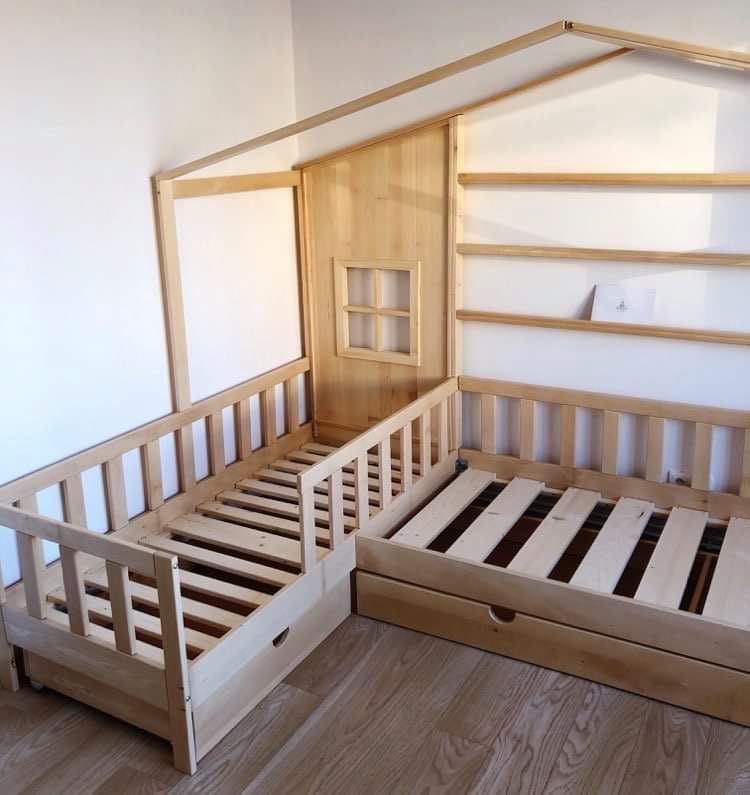 Pat dublu pentru copii tip Montessori, DOMUM, personalizat cu 2 gărdulețe în partea interioară.