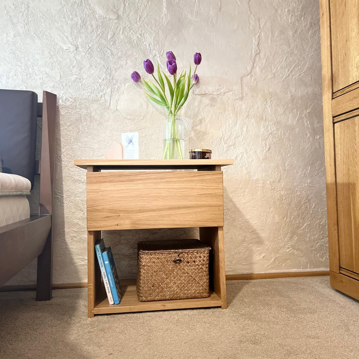 Noptieră din lemn masiv de stejar – eleganță naturală pentru dormitorul tău